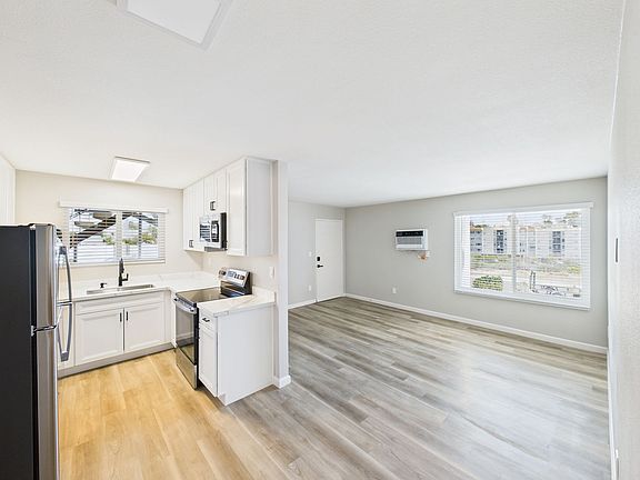 Step into this bright and stylishly updated 1-bedroom home featuring an open-concept living and kitchen area. The modern kitchen boasts brand-new white cabinetry, quartz countertops, stainless steel appliances, and a sleek black faucet for a contemporary touch. Large windows bring in abundant natural light, highlighting the fresh paint and new wood-style flooring throughout.