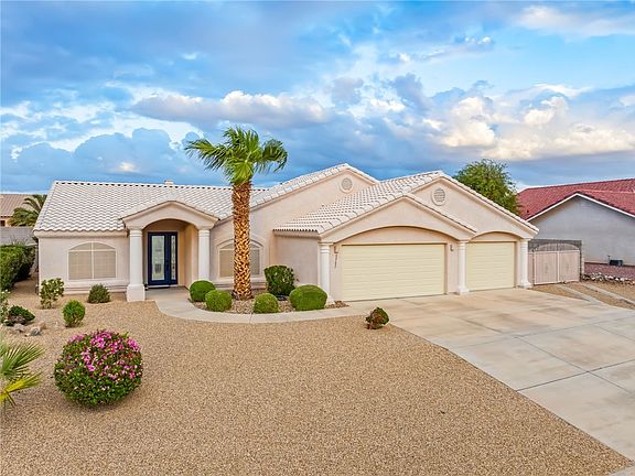 For those seeking to live in the desirable Arroyo Vista Estates with its private club house, swimming pool and spa, playground, picnic area, volleyball and basketball courts, this well maintained, 3-bedroom, 2-full bath home at 3752 Rawhide Drive just may fit both your wants and needs. For those wanting a 29 ft boat deep, 3 car garage with built in cabinets, owner owned water softener, your hunt is over. When opening the custom front door to this over 1,700 sq. ft. home, one senses the owner truly cared for this home. With freshly painted walls, tile flooring throughout (no carpet here), this spilt 3 bedroom, 2 full bath home provides not only comfort and warmth but yields privacy as well. To the right upon entering the home is currently a sitting room. With its large unique architectural window, two columns, this room could be a formal dining room, a future office or library. Entering the living room, one sees the high ceilings, the pot shelves and the wood burning fireplace along with the hall to the guest bathroom and the two other bedrooms. Both bedrooms have large closets and plenty of room for queen to even king size beds. As to the guest bath, there is plenty of natural light. A linen closet complements the hallway. Returning to the living area, one can see the kitchen breakfast bar and a small area for a cafe table. This kitchen also has a trash compactor and direct access through a short hallway to the primary bedroom, the inside laundry room with storage and 3 car garage. The primary bedroom with its cathedral ceilings, pot shelves can easily accommodate a California King size bed with plenty of room left for other furniture. A door opens to the covered porch and easy access to the kitchen. Entering the primary bathroom, one sees double vanity sinks, a large soaking tub, separate shower, a true water closet for additional privacy and a large walk in closet. The owner just recently updated the front landscaping with new gravel and plants. The backyard boasts tasteful desert friendly plants in front of the block wall leaving plenty of room if the new owners wish to have their own private swimming pool and spa. With a monthly HOA fee of $45.00, this home can be your peaceful retreat in one of the most established neighborhoods. Finally, local amenities including entertainment and water activities complement this home.
