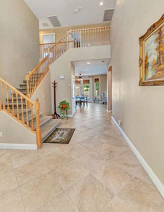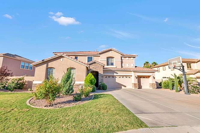 This beautiful 5 bedroom / 3 bath is in the heart of the San Tan Ranch community. Great curb appeal with mature landscaping including rose bushes and 3 car garage with extra space. The downstairs has a guest room and full bath, a formal living and dining room, large kitchen with beautiful cabinets, granite tile countertops, tile backsplash, stainless appliances - including a new microwave, large family room and arcadia door to expansive backyard. The upstairs has 4 bedrooms - master suite with 2 walk-in closets, French doors and large bedroom area. There is a loft - perfect for kids' area, study desk area, 3 guest rooms with a full bath. The staircase is wide and has a beautiful work banister. There are ceiling fans throughout, carpet in the bedrooms and main rooms w/ neutral 18'' til