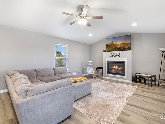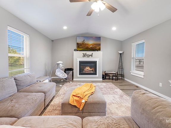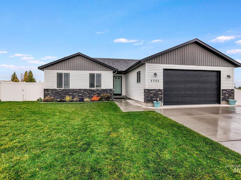 Close to town but surrounded by country charm! This beautiful home sits on over an acre and offers over 2,100 square feet of open-concept living with 4 bedrooms, 2 bathrooms, and a 3-car tandem garage. The spacious layout features LVP flooring throughout the main living areas, creating a warm and modern flow. The large master suite includes a relaxing soaker tub, walk-in shower, and a generous walk-in closet for plenty of storage. Step outside to a north-facing covered patio where you can unwind and take in stunning west-facing sunset views. Landscaping is established with over 30 fast-growing trees, a full sprinkler system, a perimeter drip line for both the garden and flower beds and a designated area for a future shop. The fully fenced yard with privacy vinyl provides both beauty and functionality. Pressurized irrigation is included through HOA dues.