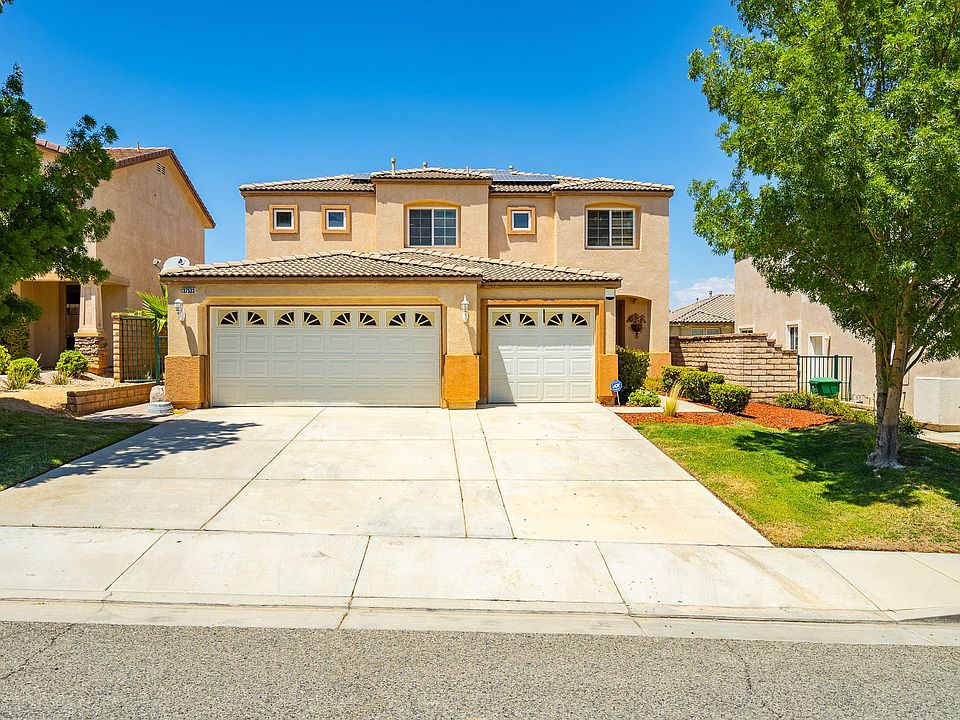 OWNED SOLAR - 21 panels!!! 2 story, 3 car garage, commuters dream home located in the highly sought after neighborhood of Anaverde.This home features 4 spacious bedrooms & a large upstairs loft, formal living & dining rooms. Light, bright & spacious home with gorgeous tile flooring downstairs. Family room with fireplace. The open kitchen is perfect for entertaining with a large island and extended cabinetry perfect for buffets, and complete with a massive walk-in pantry. Spacious master bedroom & attached master bathroom with large walk-in closets, dual sinks & a separate bathtub & shower. The second floor laundry room features storage cabinets. Ceiling fans in all bedrooms. Low maintenance backyard with stamped concrete patio & block wall fencing. FULLY PAID SOLAR 21 panels plus built in electric car charger in garage. This home is near school, parks & walking trails.