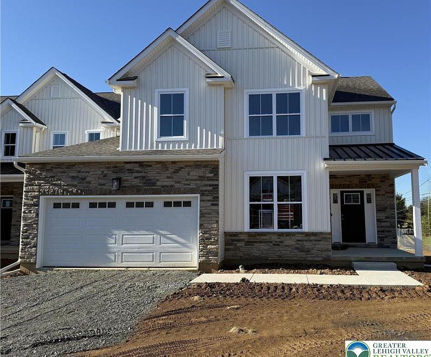 MOVE-IN READY! Welcome to the modern farmhouse Daggerwing at The Fields at Twin Run by award-winning Kay Builders. This thoughtfully designed Twin Villa in scenic Upper Milford Township within the East Penn School District features 2,135 sq. ft of living space, 3 bedrooms, 2.5 bathrooms, main-level owner’s suite, daylight basement, 2-car garage, and a 10' x 14' pressure-treated deck with vinyl railing. The gourmet kitchen features 42” cabinets, quartz countertops, tile backsplash, stainless steel appliances including refrigerator, upgraded range, large pantry, and pantry cabinet. Open living includes a two-story family room with fireplace, vaulted ceilings and loft overlook, added windows and recessed lighting, and upgraded light fixtures in the foyer, breakfast nook, and family room. Interior finishes include engineered hardwood on the first floor, oak steps with painted risers, prewires for ceiling fans in all bedrooms, family room and flex space, and an optional tech center with quartz countertop. The luxurious owner’s suite on the main level offers a large walk-in closet and a spa-styled bath with double quartz vanities, a glass-enclosed tiled shower, and soaking tub. The exterior showcases a stone facade and modern farmhouse elevation. Low HOA fees and builder warranties; premium location minutes from major highways, shopping, and dining! TR 1