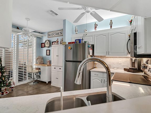 Enjoy beautiful western exposure and tranquil garden views from this well-appointed two-bedroom, two-bath residence in Fieldstone Village at Wilshire Lakes. Designed for comfortable Florida living, the floor plan includes a private, glass-enclosed sunroom that allows you to relax rain or shine, offering both screens and sliding glass panels, diagonal tile flooring, a ceiling fan, and a covered feel with peaceful greenery as your backdrop. A dedicated carport space adds everyday convenience. Inside, diagonal tile flooring and crisp white plantation shutters create a light, cohesive look throughout the main living areas. The kitchen features white cabinetry, quartz countertops, a tile backsplash, newer stainless steel appliances including a range, microwave, dishwasher, and refrigerator/freezer, along with two ceiling fans and a cozy breakfast area. A pass-through window opens to the formal dining space accented by elegant wall trim, while a door off the kitchen provides access to a private courtyard-style entry, conveniently located next to the front entrance and ideal for welcoming guests or enjoying a quiet outdoor moment. The living room offers seamless indoor-outdoor flow with glass sliders leading directly to the sunroom. The owner's suite is a relaxing retreat with private access to the sunroom, a walk-in closet, and an en-suite bath featuring a dual-sink marble vanity with full-width mirrors, a walk-in shower with bench and niche, glass enclosure, and a linen closet. The guest bedroom, currently set up as an office, includes a closet and plantation shutters and is conveniently located near the adjacent bath with a marble vanity and a fully tiled walk-in shower with glass enclosure. A dedicated laundry room with overhead cabinetry and an LG washer and dryer completes the interior. Fieldstone Village at Wilshire Lakes is centrally located west of I-75 along Vanderbilt Beach Road, just minutes from the Gulf beaches, Mercato, downtown Naples, and easy interstate access. Residents enjoy resort-style amenities including a clubhouse, pool, tennis courts, and fitness center. Whether you're seeking a seasonal escape or a year-round residence, this North Naples condo offers privacy, convenience, and an exceptional lifestyle close to shopping, dining, golf, and entertainment.