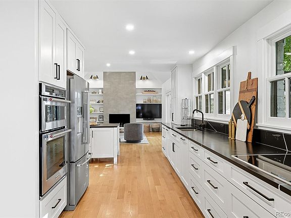 Inside, natural light pours through new windows, highlighting solid white oak floors and clean architectural lines. French doors open from the front sitting room to a covered porch, while vaulted ceilings in the main living room frame a striking gas fireplace flanked by custom built-ins. At the heart of the home, the kitchen offers both function and beauty with stainless KitchenAid appliances, expansive cabinetry, and a central island designed for gathering.