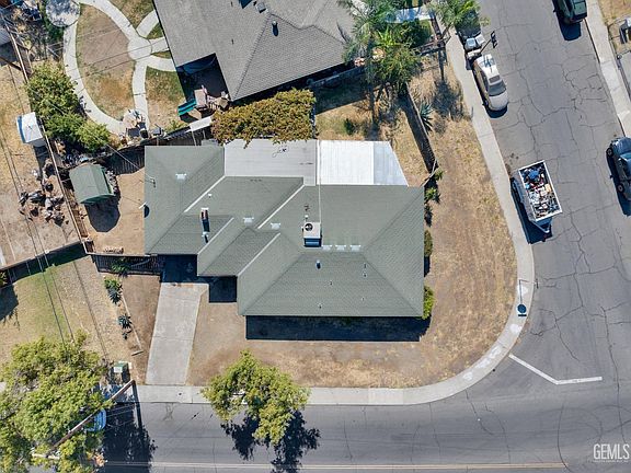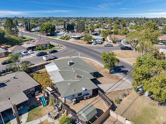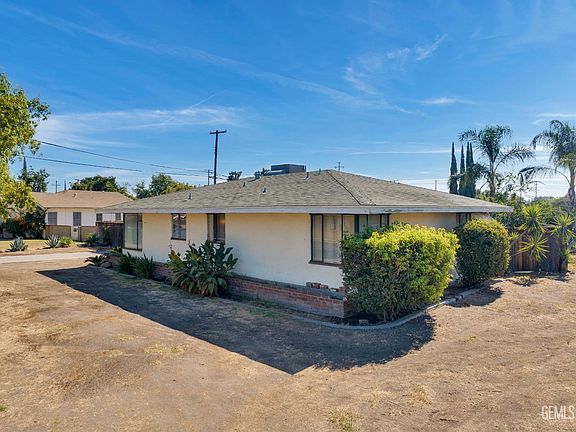 Corner lot in Fresno. This 3 bed 1 bath home is 1338sf features central heat and air, hardwood, laminate and carpet flooring, large living room area with large bay style windows for lots of natural lighting, fireplace and crown molding, tile kitchen counters, white cabinets and appliances. The home also includes 3 cozy bedrooms one with tongue and groove wood panels, bathroom includes 2 vanities and a separate shower and tub. The front of the home includes a long driveway with possible RV area. The side includes a barn style shed and room for storage. The backyard includes a large covered patio perfect for weekend BBQ's and a grass area for Fido.