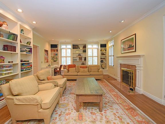 - Family Room Feat: Window Treatment, Fireplace, Wood Floor, Bookcases