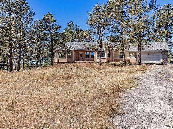 Located on peaceful and private 2 acres, this Sable Ridge home is designed for Colorado living. Smartly situated on a spectacularly wooded lot with ponderosa pines, this ranch with a full finished walk-out basement allows for flexibility in lifestyle. There are 4 bedrooms, 3 bathrooms, multiple living spaces and flex spaces. Step inside to discover a floorplan with unique architectural details such as curved walls, detailed trim, crown molding and vaulted ceilings. The main level features a primary suite and second bedroom, while the walk-out basement boasts an additional two bedrooms and a versatile office space. The primary suite includes a private entrance to the backyard deck, providing a tranquil space to relax and enjoy the natural surroundings. Cozy up next to the gas fireplace on cool evenings, or indulge in radiant flooring for added comfort. The open concept floorplan in the finished basement has a wet bar and a generous number of cabinets. The oversized 2-car attached garage has built-in cabinetry and backyard access. A southeast facing driveway circles around to the rear of the property. The stucco and aluminum siding exterior is both visually appealing and low-maintenance. This property is being sold as-is, no exceptions. It is priced appropriately for the market. Please view and compare to 37413 Sable Ridge Road which closed on 6/26/23 for $835,000. Call to set your showing today.