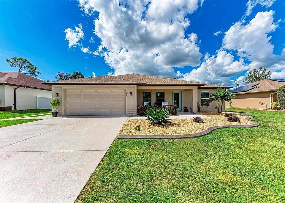 Stunning 2021 Home with Modern Upgrades and Prime Location Welcome to this beautifully designed 3-bedroom, 2-bath home featuring an open floor plan, impact windows, and a spacious 2-car garage. From the moment you arrive, the inviting 18-foot front porch with shiplap accents and a decorative glass entry door set the tone for this stylish residence. Inside, soaring vaulted ceilings, expansive windows, and porcelain plank tile flooring throughout create a bright, airy, and welcoming atmosphere. The gourmet kitchen offers 42-inch farmhouse-style wood cabinets with pull-out drawers, stainless steel appliances, built-in charging stations, and elegant chrome pendant lighting. The private owner’s suite features a generous walk-in closet with custom built-in shelving. The ensuite bath is a retreat in itself, complete with dual granite-topped vanities, a walk-in shower, and a rain shower head. Step outside to the fully fenced backyard for added privacy. An air-conditioned shed provides flexible use as a workshop, playhouse, or additional storage. Notable upgrades include: • Impact windows for safety and energy efficiency • Gutters throughout the outside • New landscape • Outdoor lighting • Cabinets in the garage and laundry room • Heat barrier attic insulation for year-round comfort • Extended driveway and concrete side pad • Public water and sewer, a rare advantage in this area Perfectly situated across from Heron Creek Golf & Country Club and minutes from shopping, schools, and the new Sarasota Memorial Hospital. Enjoy quick access to I-75, the Atlanta Braves Spring Training Stadium, and some of Florida’s most beautiful beaches.