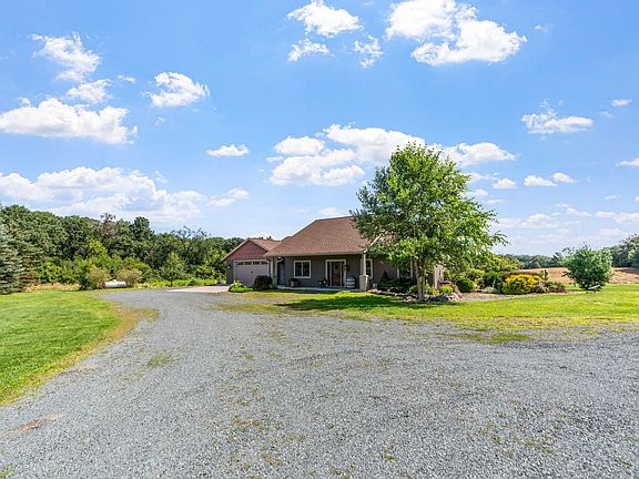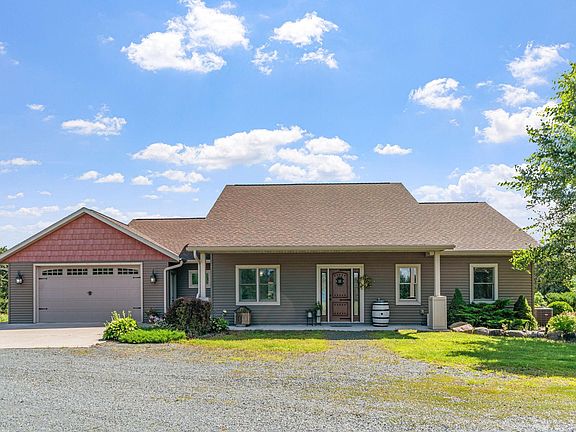 Nestled on a serene 2.75-acres in the countryside, this custom, quality built, luxury home features over 2,300FSF all on ONE convenient level! Walk up to a welcoming front porch + a beautiful detailed front door! Once inside you are greeted by warmth + gleaming maple hardwood floors! No details were spared here with 9 foot ceilings, in floor heating + the living room w/ an impressive corner stone gas burning FP with handcrafted, repurposed wood mantel + knotty pine vaulted ceilings! The kitchen features LVT floors, cherry cabinets, corian counters, subway tile backsplash, upper + lower cabinet lighting, stainless steel appliances, breakfast bar + a wine fridge! Off the kitchen is a primary suite with over 500 FSF that features barnwood walls, a door leading you outside to your rear covered paver patio with a tranquil water feature, large walk-in closet + bathroom with double sinks, walk-in shower w/ rainhead + your own urinal! There are 2 additional bedrooms, a full bathroom + a formal dining room, currently used as an office. For those who work from home or seek a peaceful retreat, the property includes the ultimate work-from-home 14 x 16 shed with heat + electric or use as a delightful she shed—ideal for creative pursuits + quiet relaxation! While an oversized 60 x 36 pole building provides plenty of room for storage or hobbyist activities + features a 3/4 cedar lined bathroom + kitchenette w/ microwave! This is a haven for nature lovers, with abundant wildlife + private picturesque views where you can unwind + enjoy the beauty of nature every day!