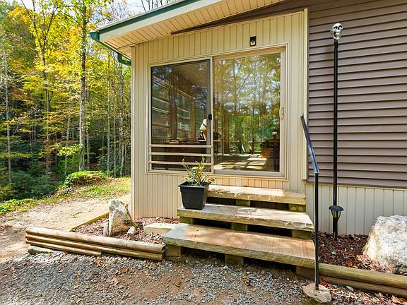Looking to get away from everyone? You'll never find a more private spot! Tucked away at the very end of a long, gravel mountain road, this charming 2-bedroom, 1-bathroom cabin offers nearly 2 wooded acres of privacy with no one around! A gravel driveway winds beneath a canopy of hardwoods and pines, leading you to a peaceful home with ample parking and an attached single carport. Step into the enclosed sunroom, a comfortable, light-filled space with walls of windows and sliding glass doors at both ends, and inside to the Great Room that welcomes you with warm wood floors, a wood-paneled ceiling, and a striking wood accent wall. A WOOD-BURNING STOVE perched on a stone hearth adds cozy character and warmth. The kitchen is spacious and functional, featuring plenty of cabinets, generous counter space, tile floors, and a handy pantry. Both bedrooms offer wood floors and built-in cabinetry, while the large bathroom includes a step-in shower and convenient laundry area. Outside, enjoy the expansive deck complete with a HOT TUB (included!) and gazebo. In the yard is a FIRE PIT for cool mountain nights. A detached workshop with power, a roll-up door, and attached carport provides great functional space, complemented by TWO additional outbuildings. Several years of cut and stacked firewood are ready for your use (that's included, too!). This property has been extensively remodeled over the past nine years, including new windows, siding, plumbing, wiring, gutters with leaf guards, soffits, enclosed sunroom, and deck. A new well, septic system, and drain field were also installed, and the roof was replaced in 2019. Additional upgrades include a tankless on-demand water heater and backup water connection to a spring. With NO HOA, NO RESTRICTIONS, and abundant natural beauty, this home is waiting for you to come see it and make it your haven!