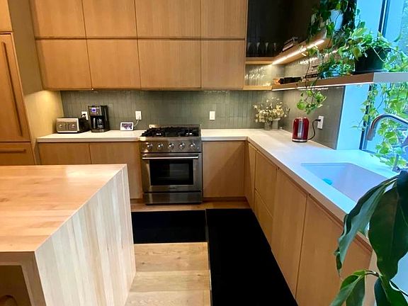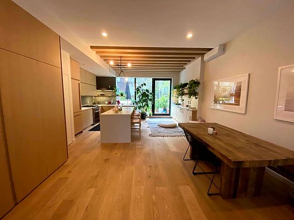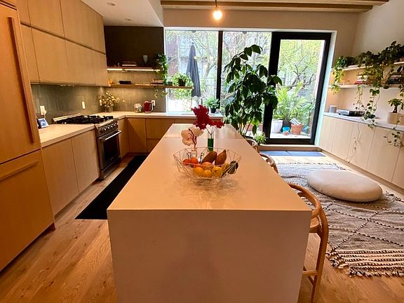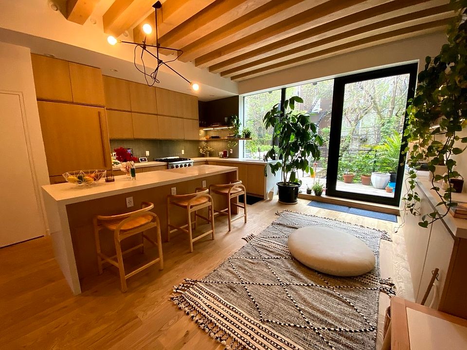 Beautiful 3 bedroom, 2 bathroom townhouse with open plan kitchen and living, sunny deck and backyard. Property is a two levels. Newly renovated with high quality fit outs. Internal access to a full size basement. First floor consists of an open plan kitchen, living and dining with large island, top of the range appliances including dishwasher and gas oven and stovetop and built in fridge. Kitchen has large glass wall with large door opening out to a sunny large deck and backyard. Open plan living with built in storage and closet for coats and shoes. Wide large floor plan. Upstairs has three good sized bedrooms all with closets. Washing machine and dryer. Family bathroom has a ceramic bath tub, custom tadelakt finish and hand made tiles. Master bedroom has a walk in closet and large bathroom with window. Walk-in shower, double vanity, tadelakt finish and hand made tiles. Owners renovated the townhouse recently with kitchen being featured in a number of magazines such as Remodelista, Domino and Brownstoner. Rent includes water and electricity (up to $300 per month). Full property can be rented for $7,500 per month which includes a 2 bedroom garden unit below. Link to unit listing below. This home is conveniently located near entertainment and some of the top restaurants in the area such as, Milk and Pull, Chez Oskar, Trad Room, Casa Blanca, Saraghina, Peaches, and Eugene & Co. With less than a 5 minute walk to the A/C train lines, getting to Manhattan is super easy. The B26 bus stop is also located on the corner. No fee, owner rented.