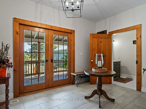 Welcome to this enchanting 1860s farmhouse, set on over 5 acres of private, park-like land just 30 minutes from Kingston. A long, tree-lined driveway leads to the charming 4-bedroom home, where original character blends seamlessly with modern updates. Inside, the main floor offers an inviting layout with a spacious kitchen, dining room, family room, laundry, and 2-pc bath. The main floor also features a versatile bonus room with a wood-burning fireplace currently used as the primary bedroom with ensuite, creating a cozy retreat. Upstairs you'll find four bedrooms and a full bath, while the partially finished basement provides a rec room and generous storage. Enjoy economical year-round comfort with the updated geothermal heating and cooling system. Outside, a detached triple-car garage, landscaped gardens, and plenty of open space complete this enchanting property. Perfect for those seeking historic charm, modern comfort, and peaceful country living.