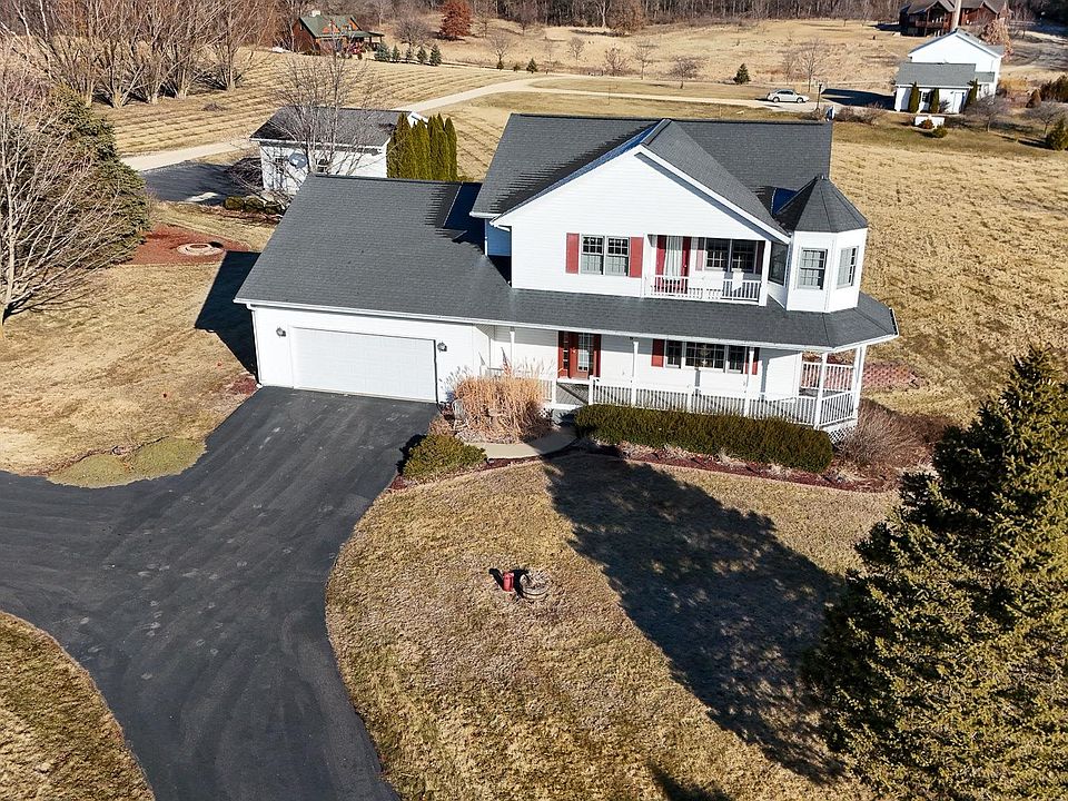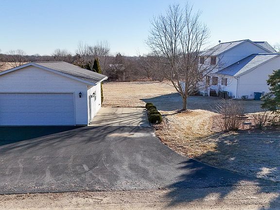 Set on 2.5 peaceful acres just west of Dixon, this beautifully maintained 3 bedroom, 2.5 bath home offers space, privacy, and comfort in a setting that feels like a retreat. Inside, the thoughtful layout is filled with natural light and enhanced by recessed lighting throughout the main living areas. The kitchen and dining space is both functional and inviting, featuring hardwood floors, granite countertops, a center island, and easy access to the back deck, perfect for everyday living or entertaining. The open living room anchors the main level with a gas fireplace that was fully renovated in 2020, creating a warm and welcoming focal point. A main floor laundry room, powder room, and charming foyer round out the first level. Upstairs, the primary suite is a true standout, offering a private balcony, an 8x8 alcove ideal for a home office or reading nook, and a beautifully finished en-suite bath with a tiled walk in shower and double vanity. Two additional generously sized bedrooms and a full bath complete the second floor. The partially finished walkout basement adds flexible living space with a family or recreation room, direct outdoor access, and abundant storage. Outside, enjoy both a front porch and a large back deck, perfect spots to relax and take in the surrounding nature and wildlife. With an attached two car garage plus an additional detached two car garage, this property offers exceptional storage and workspace. Major updates include a new well pump (2025), A/C, furnace, and fireplace renovation (2020), water softener (2018), roof (2016), detached garage (2012), and septic (2007). Move in ready, thoughtfully updated, and set in a serene location, this is country living at its best.