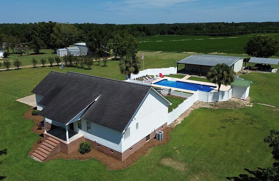 Welcome to your dream country retreat! This spectacular home blends rustic charm with modern luxury, featuring rich hardwood floors, energy-efficient LED lighting, and spacious walk-in closets. Unwind in the elegant sunken tub or take in the serene views from every window. Step outside to your private backyard oasis with an in-ground pool, surrounded by a tall privacy fence for complete seclusion. Perfect for entertaining, the detached cook house overlooks a beautiful country setting and includes its own fully equipped kitchen, full bathroom, and shower—ideal for family gatherings, cookouts, or guest stays. Whether you're sipping morning coffee on the porch or hosting under the stars, the peaceful surroundings make every moment special. Private, functional, and full of charm, this is country living at its finest!