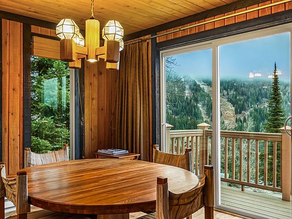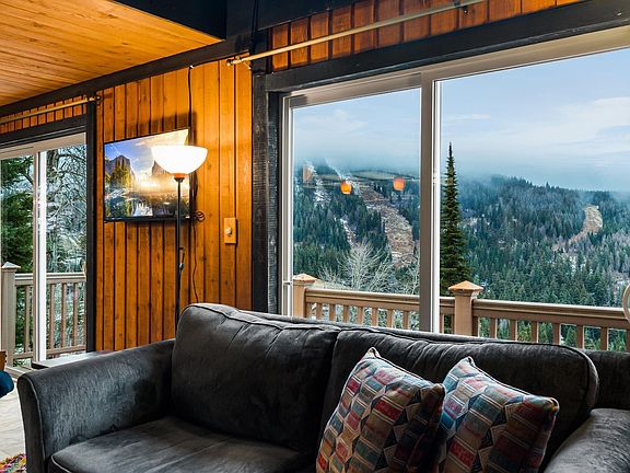 Schweitzer Mountain condo located in the iconic Der Kastle building, offering a rare opportunity to own a classic Schweitzer ski condo with authentic mountain character. Original design elements remain throughout, including vaulted wood ceilings, exposed beams, and a dramatic two-story stone fireplace that creates a timeless lodge-style atmosphere. The light-filled living space features mountain and ski hill views and opens to a private balcony, while the kitchen embraces its era, providing both vintage charm and the opportunity to personalize over time. Wake up to Schweitzer Mountain views from the primary suite, and enjoy flexible sleeping arrangements with three bedrooms plus a loft. A private hot tub room adds a highly sought-after mountain feature, ideal for relaxing after a day of skiing, hiking, or mountain biking. The condo also includes a private entrance, a one-car garage with workbench—perfect for ski tuning and gear storage—and additional parking. Located just minutes from Schweitzer Mountain Resort lifts, ski runs, hiking trails, and village amenities, this property offers four-season recreation and a rare opportunity to own a genuine piece of Schweitzer history.