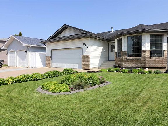 This 1307 sqft home is in immaculate condition and ideally located—just steps from schools, shopping, and a park The main floor features a spacious living room, with dining area and built in cabinetry. The kitchen comes fully equipped with fridge, stove, built-in dishwasher, microwave, under-cabinet lighting, pull-out drawers, and a pantry for extra storage The large primary bedroom has a walk-in closet, 3 piece ensuite with jetted tub and dedicated vanity counter. Additional upstairs is another bedroom, and 4 piece main bathroom. The basement includes a large family room, with a cozy fireplace, a 4-piece bath, and 3 more bedrooms (downstairs bedroom windows may not meet egress) making it perfect for growing families or guests. Laundry is located downstairs with a laundry chute from a hall closet upstairs and a washer, dryer. Leading off the kitchen through a set of french doors is the back deck, a beautiful backyard with underground sprinklers, perennial gardens, vegetable garden area, shed and a tranquil creek-style pond. This great Bungalow also features a heated, insulated 22x22 double garage. Title Insurance will be supplied in lieu of a Real Property report and compliance. Property and unattached goods will be sold "where is as is." Call for your private viewing today, as this home will not last long.