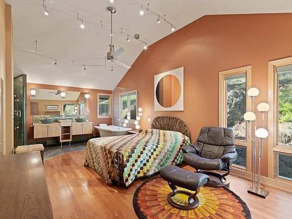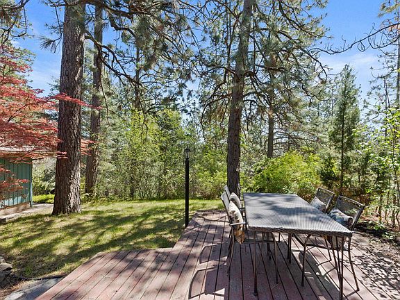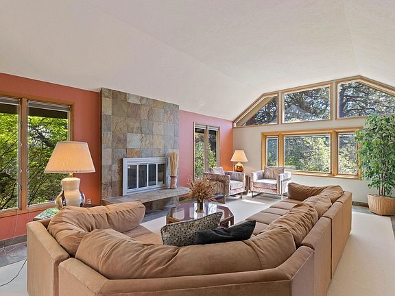 This spacious custom home is hidden, perfectly nestled into the landscape and surrounded by mature pine forest. Best of both worlds, private yet close to town. The main floor offers two large family rooms with their own fireplace. Formal dining, a powder room and gorgeous kitchen. The kitchen was recently remodeled and has stainless steel appliances, ample built in storage, soft-close cherrywood cabinets and drawers, topped with granite countertops. Off the kitchen is an entertainers dream. A large deck with built in lighting, stunning waterfall feature, complete with territorial views. The second, private back patio, secluded and perfectly nestled into the basalt rock shows a one-of-a kind feature. Upstairs there are three bedrooms and two bathrooms. The primary bedroom is massive with an open concept and vaulted ceilings. The whole suite was recently remodeled. Updates include a walk-in custom closet system, large walk in shower, double stone sinks with modern vanity and soaking tub.