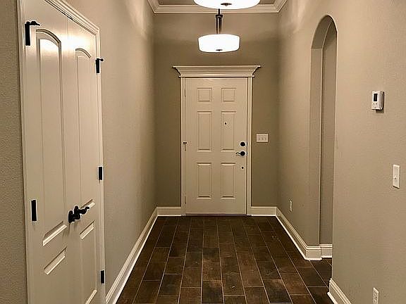 Inside, the home showcases extensive crown molding, elegant matte porcelain wood-look flooring, and cozy carpeted bedrooms. Recent updates include a stylish accent wall in the primary suite, upgraded modern light fixtures, and a new AC unit installed just two years ago.