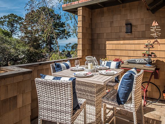 Views of the ocean and Point Lobos through the trees can be seen from the sunroom and dining area, as well as the kitchen and large windows letting in abundant light to the 995-square-foot residence. The sophisticated decor with coastal accents has a color palette of oceanic blues, bright whites and driftwood color scheme predominating, complemented by dark hardwood floors, plush rugs and artwork reflecting the beauty of the Monterey Bay.