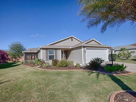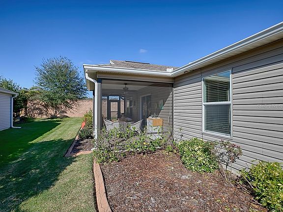 3/2 "AT EASE" charming COTTAGE HOME in popular VILLAGE OF HILLSBOROUGH is the perfect Florida RETREAT with NO HOMES behind. The SIDE SCREEN LANAI & BIRDCAGE provide an OUTDOOR OASIS with a backyard PRIVACY WALL & TREELINED BACKDROP. Interior features NEUTRAL colors throughout, GORGEOUS STAIN GLASS entry & storm doors, kitchen PANTRY CLOSET, oak CABINET GALORE with pullouts & lazy Susan, STAINLESS STEEL APPLIANCES, LOVELY granite like LAMINATE counters, BRIGHT & CHEERY, OPEN FLOOR PLAN, VAULTED ceilings, INDOOR LAUNDRY, ceiling fans, Master ENSUITE bath has DUAL SINKS, large WALK IN CLOSET, step in shower, TUB/SHOWER in guest bath & both guest bedrooms have closets. OWNERSHIP PRIDE shows through this "LIKE NEW" charmer. Relax or entertain in the spacious LANAI & BIRDCAGE with ceiling fans & SOLAR SHADES & canvas topper. Pretty CURB & street APPEAL, PAINTED driveway & walkway, DOUBLE garage. CONVENIENT TO ALL THE AMENITIES The Villages has to offer & minutes from BROWNWOOD PADDOCK MARKET SQUARE. Start LIVING THE DREAM in sunny Florida. Call to schedule a private or virtual tour. This one will not last!