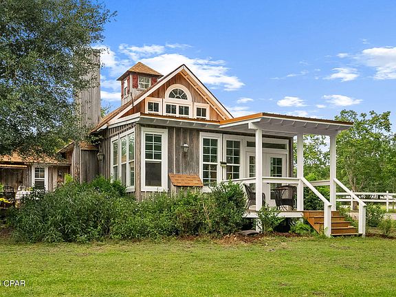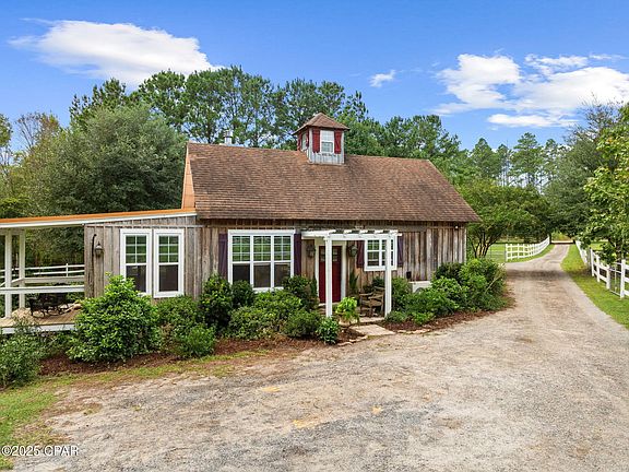 A RARE FIND — This unique 10-acre farm nestled in the scenic rolling hills of New Hope, offers a charming 1,400 sq. ft. custom-built home, two spring-fed stocked ponds, and an income-generating, turnkey 7-stall horse training and boarding facility with multiple barns and expansive, beautifully fenced pastures. There is a 475 sq. ft. paddock/tackroom apartment and a 720 sq. ft. building ready to become a mother-in-law suite/office/design studio. The 2016 two bedroom home exudes rustic European charm with board-and-batten cypress siding, exposed post-and-beam framing, soaring cathedral ceilings, roof cupola, French doors, wood and tile floors, 2 cozy fireplaces, 2 covered porches, 2 decks and a dock overlooking the serene ponds. Gated Entry with 750' asphalted driveway, 35 minutes from PCB. Additional features and accessory buildings include: 5 1/2 acres under fenced pasture, 3,300 ln. ft. 3-rails white horse fence. Main Barn is 720 sq ft offers 12 x 20 center isle, (3) 11x12 stalls, 11 x 12 feed-room. Access to 2.5 acre pasture. Paddock/tack-room building -offers (2) -12 x 12 stalls, 4 x 6 feed-room and a 470 sq.ft. tack-room/apartment. Workshop/storage shed- 192 sq.ft., 96 sq.ft. storage and 12 x 12 carport. Access to 2.5 acres pasture. Pony barn - 328 sq. ft. (2) 12 x12 stalls, Feed room 40 sq ft. access to .5 to 2.5 acre pasture. Design Studio/Mother-in-Law building/720 sq. ft. under roof, 480 sq. ft. dried-in, poured slab floors with additional nook for wood burning stove. Chicken house/storage is 300 sq. ft. Pump house is 64 sq.ft.- houses well pump, generator and extra storage. Multiple spaces invite ''homesteading'' with gardens and orchard potential, while mature pecan and fruit trees add natural beauty. This property is bordered by a 15-acre private residence, an 18-acre horse sanctuary, and thousands of acres of conservation land, offering unmatched privacy, peace, and an idyllic setting for your hobby farming, or country estate dreams. Bring your horses and enjoy a turnkey facility ready for boarding or training. Horses pictured are not included in the sale. Don't miss this opportunity. Call for viewing instructions.