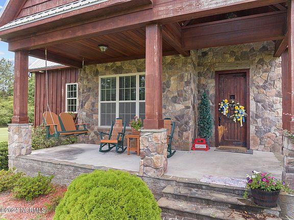 Welcome to your dream home in Stokes, NC! This stunning property sits on over 5 acres of picturesque land. The exterior showcases a beautiful combination of cedar and stone, complemented by a durable metal roof. Step inside through a custom-made front door and greeted by tile floors throughout the downstairs area. The living room boasts wood beams, gas logs, and a hearth fireplace, creating a cozy ambiance. Enjoy movie nights with the built-in surround sound and Blue-ray system, which conveys with the home. The kitchen is a chef's delight, featuring granite countertops, farmhouse sinks, and an eat-in bar that seats five. The dining area offers built-ins and charming window seating. The well-appointed laundry room includes built-ins, a utility sink, and a walk-in shower. A half-bath with granite countertops and a copper sink adds a touch of luxury. The downstairs area is handicap accessible and includes a hidden door under the stairs for tornado safety. The primary bedroom features French doors leading to a covered porch, the en-suite bathroom includes a double vanity, a large wall-in closet, and a wall-in tile shower. Upstairs, you will find beautiful hardwood floors, full bath and a nook that could be used for office space. The property offers a concrete drive leading to a double carport. The covered back porch includes an outdoor kitchen with a fridge, double burner gas cook-top, egg, and sink perfect for entertaining. On the side of the home, there are hot and cold-water hookups for a camper. The horse pasture is equipped with electric fencing and two large pecan trees. This exceptional property combines luxury living with practical amenities for both you and your horses. Don't miss the opportunity to make this unique home yours!