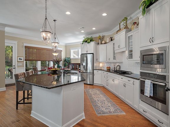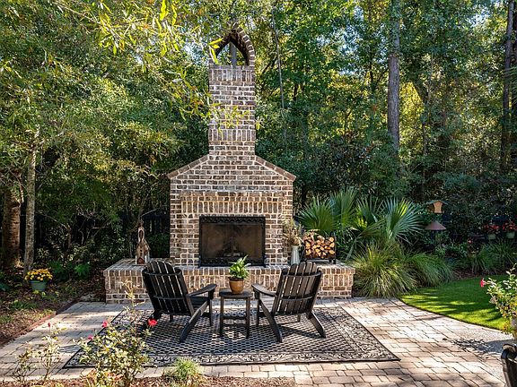 Outdoor fireplacePlantation shuttersFull front porchElegant settingVersatile loftPrivate beautifully landscaped lotExpansive island