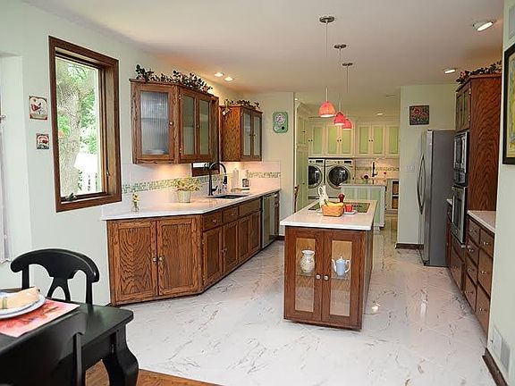 This spacious and charming, custom-built home is located at the end of a quiet cul-de-sac, on a landscaped, park-like, wooded lot that measures .8 acre. You will love the solid hardwood floors and custom cabinetry that grace this open and welcoming home. The kitchen features built-in stainless steel appliances and beautiful new quartz counter tops, open to a large dining area including a room length custom wood built in window seat. A laundry area features floor to ceiling cabinets and spacious island