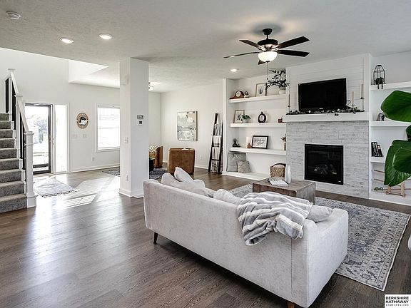 Beautiful 2-story home in Elkhorn! This spacious 4-bedroom home with a private main-floor office offers a fantastic, functional layout. The stunning kitchen features quartz countertops, a tile backsplash, stainless steel appliances, crisp white cabinetry, and a huge hidden pantry. Durable LVT flooring flows throughout the main level. The family room impresses with tall ceilings, large windows, a stone and shiplap fireplace, and custom built-ins. Upstairs you’ll find 4 large bedrooms-each with ceiling fans and generous closets. The primary suite includes dual sinks, a soaking tub, oversized shower, and a huge walk-in closet + bonus sitting room area! The lower level is ready for your finishing touch and already includes a brand-new ¾ bath. Located just one block from a park and walking trails!