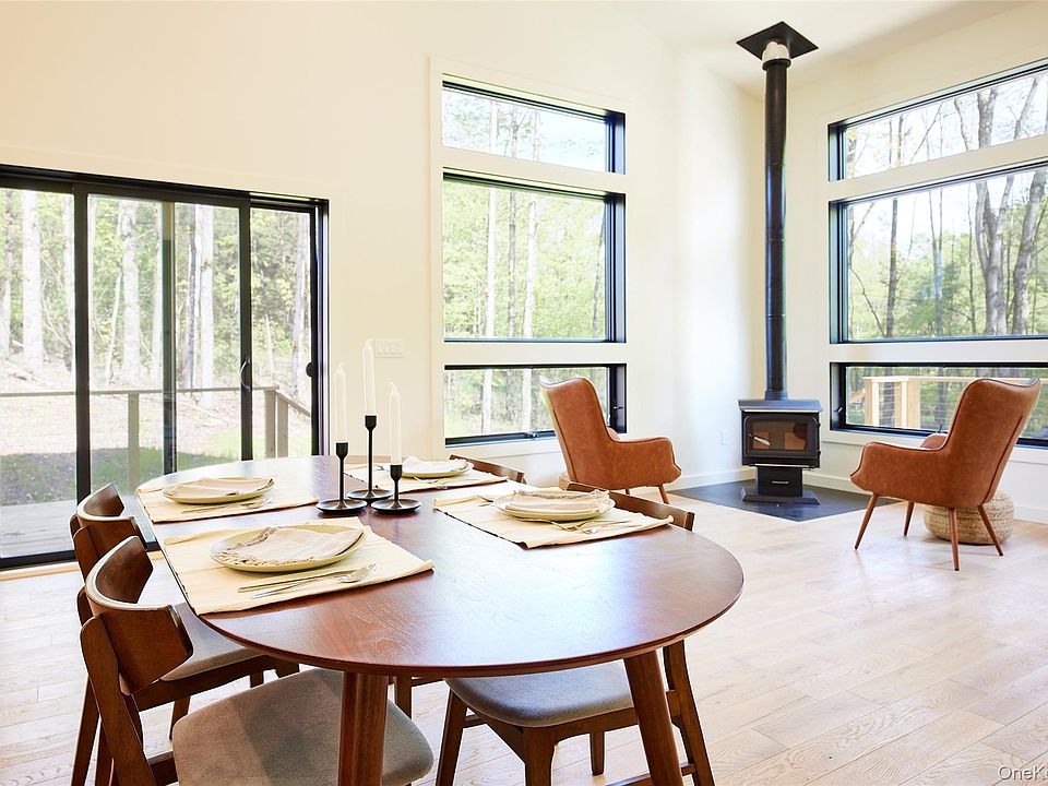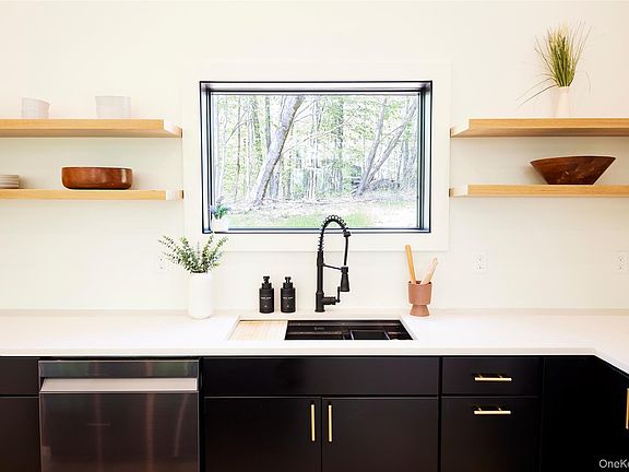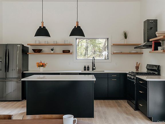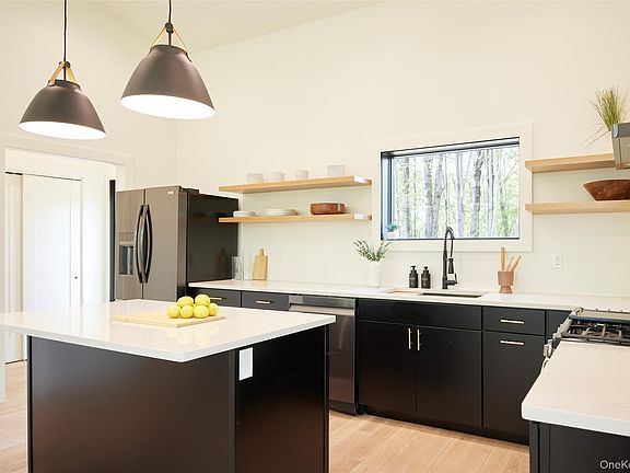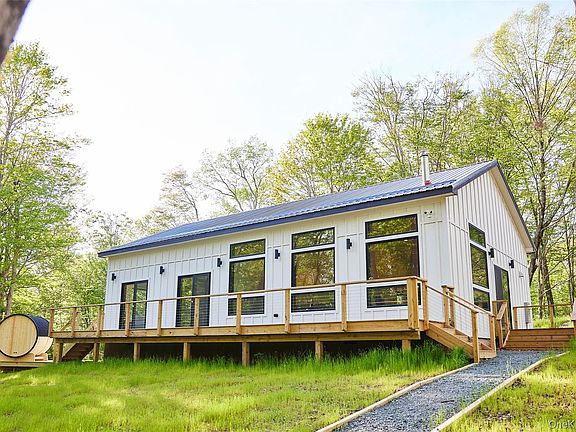 In a quiet corner of the Western Catskills, sits Woodsview Hideaway, a stylish modern retreat. Designed with an eye towards maximizing the enjoyment of the surrounding landscape, this beautiful home in Jeffersonville, NY is brand new and move-in ready for its first owners. The entranceway offers a convenient coat closet and guides you into the sleek and spacious kitchen. Modern flat front black cabinetry is complemented by open shelving, white granite counters, and black stainless appliances. The island provides a nice visual break from the main living space as well as convenient additional storage and counter space. The dining space and main living area take full advantage of the light and views from glass sliding doors and walls of oversized windows, highlighting the surrounding landscape and offering plenty of room for gathering with friends and family. The high ceilings maximize the natural light and keep the space feeling like an expansive extension of the outdoors. All three bedrooms at the Hideaway feature sliding glass doors out onto a deck and plenty of storage space. The primary suite adds a show-stopping picture window and double closets leading to a beautifully tiled en suite bath with walk-in shower, large soaking tub and double vanity. An additional tiled bath with walk-in shower and a convenient laundry room finish off the indoor spaces. White oak floors and high ceilings feature throughout. Central heating and a/c will keep you comfortable year-round, and spray foam insulation throughout keeps everything energy efficient. Hardiplank siding and a metal roof offer easy maintenance in the future. Outdoors, the large deck provides plenty of space for outdoor hangs. Follow it out to a lower platform with a two person sauna - a luxurious escape during chilly winters, or just a cool Catskills evening. A spacious flat lawn wraps around the house, with a large firepit area on the rise just behind the house. Located conveniently to several of our favorite Upstate Main Streets, Woodsview is just five minutes from the town of Jeffersonville, and fifteen minutes from both Livingston Manor and Callicoon.
