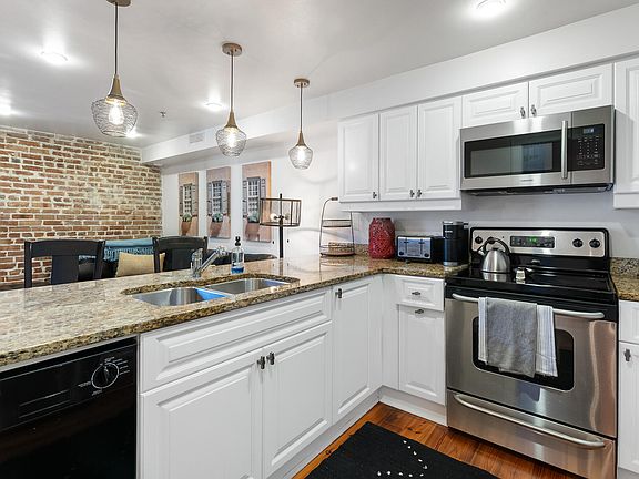 New water heaterEat-in kitchenIron spiral staircaseStainless steel appliancesExposed brick wallsPrimary bedroomVaulted open floor plan