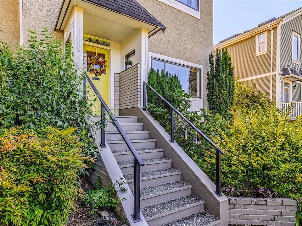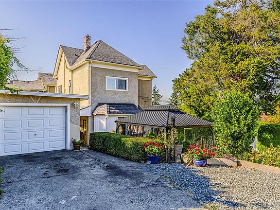 Old City Quarter Heritage Home with Ocean Views beautifully renovated modern 2,500 sq. ft. 3-bed, 2-bath home on a 0.22-acre corner lot. Bright interiors feature oak floors, stained glass, crown molding, and a grand staircase, blended with modern updates—heat pump with A/C, renovated baths, and a stylish custom designed kitchen with island, granite counters, and breakfast nook. Plenty of storage. All new plumbing and electrical. Stunning harbor and mountain views from main and upper floors. Lower level offers office/den, laundry, and storage. Enjoy private gardens, fruit trees, patios, and a courtyard. Detached shop/garage plus ample parking. Zoned R14 for future development—ideal for a carriage house or fourplex with room to grow. All data including measurements are from sources which we believe to be reliable but should be verified if deemed to be important. Just steps away to Harbor-Air, Helijet and BC Ferry rides to Vancovuer. On bus route. Easy to show, dont miss out on this one!