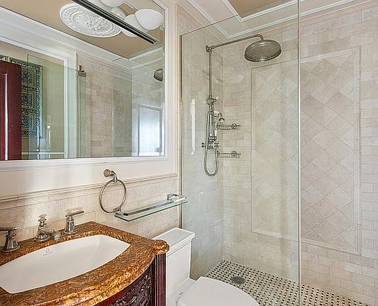 The chef’s kitchen features striking Italian Onyx countertops, custom cabinetry, and stainless steel appliances—perfect for both everyday living and effortless entertaining. The spa-caliber bathroom is finished in custom marble and tile, complete with a glass-enclosed monsoon rain shower for a true retreat-at-home experience. Bespoke woodwork, refined moldings, and thoughtfully curated lighting create a sense of timeless Downtown elegance.