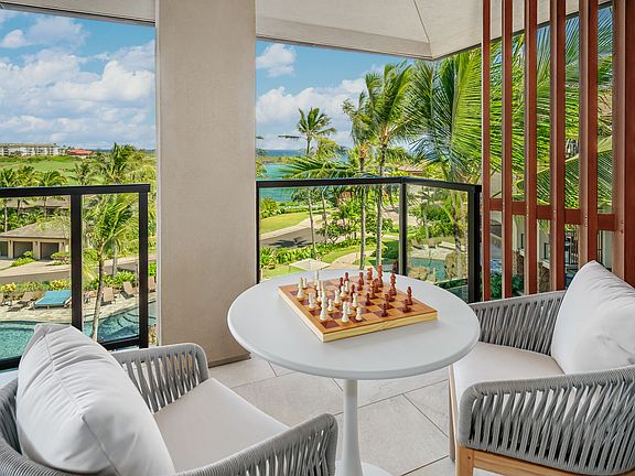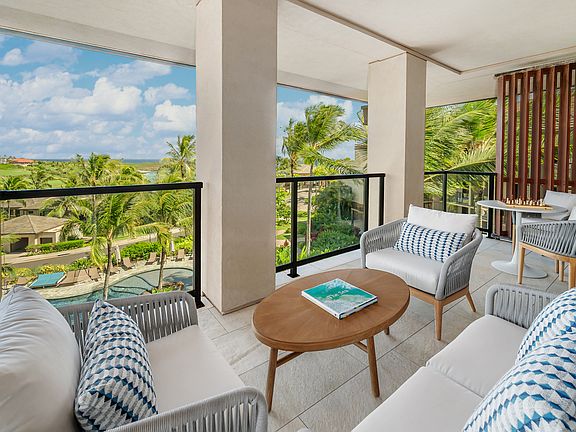 This gorgeous 3 bedroom/3.5 bath penthouse boasts beautiful Kauai sunrise views across the grotto pool to the Ninini Pt. lighthouse and Running Waters Bay from the four spacious lanais. The location of this home offers privacy and serenity and stunning views from every room of the tropical surroundings. Inside you’ll find an exceptional level of finish, with thoughtfully designed custom cabinetry, natural stone vanities and beautifully appointed kitchen that feature Thermador and Bosch appliances. The residence is beautifully furnished by Henderson House and is offered fully turn-key.