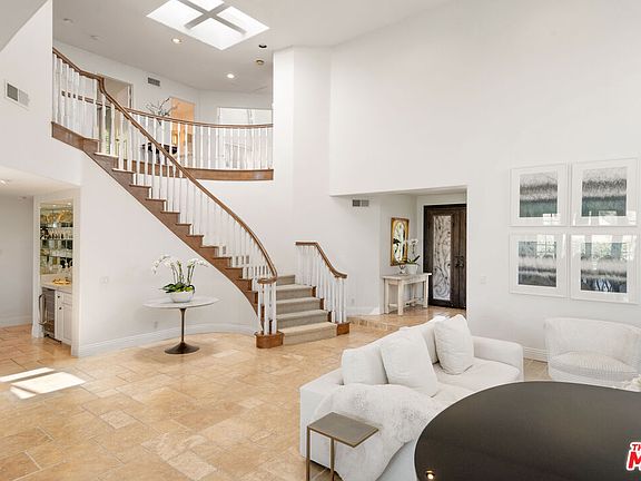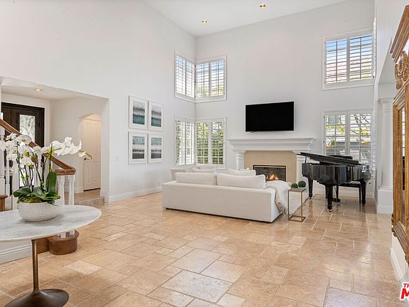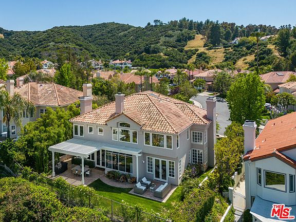 This beautifully redesigned five-bedroom, five-bath residence offers a grand sense of scale paired with refined design and modern comforts. With over 4,000 square feet of thoughtfully planned living space including both formal and casual gathering areas, this home was made for elegant entertaining and relaxed everyday living. The spacious, private backyard follows the theme outdoors with lush landscaping, a trellis-covered dining area, and generous space to unwind, host, or enjoy time with family and friends. This home delivers style, space, and serenity in equal measure. Located in the highly desirable "Carrara" enclave by J.M. Peters, celebrated for its thoughtful architecture and airy, light-filled floor plans, the home is positioned to take full advantage of mountain ridge views. Thoughtfully remodeled, the layout is gracious and welcoming, ideal for both entertaining and everyday living. A set of custom wrought iron double doors opens into a dramatic entry with sky-high ceilings, a sweeping staircase, and a central skylight that bathes the interior in natural light. Wide-plank shutters, oversized windows, and French doors create seamless indoor-outdoor flow, while crisp white walls, chiseled-edge stone floors, and rich dark hardwood flooring add texture and warmth throughout. Ambient lighting, designer fixtures, and three upgraded fireplaces lend an elevated, curated feel. The formal living and dining areas flow effortlessly into a mirrored bar alcove with Calacatta Vadara quartz counters and a built-in wine fridge, perfect for entertaining. At the heart of the home, the open-concept kitchen and family room serve as the ultimate gathering space. The bright gourmet kitchen features waterfall-edge Calacatta Vadara quartz counters, a large center island, white cabinetry with pull-out drawers, and a full suite of stainless steel appliances. A double-wide pantry offers generous storage, and the adjoining family room opens through French doors to a shaded outdoor dining area, accented with an iron chandelier and surrounded by a lush grassy yard lined with white climbing roses. Upstairs, the grand primary suite is a peaceful retreat, accessed through double doors and framed by vaulted ceilings and panoramic views. Hardwood flooring continues throughout, and the suite includes a cozy sitting room with a fireplace, Hunter Douglas designer blinds, and an additional wardrobe wall for extra storage. The en-suite bath is spa-inspired, featuring dual vanities, a frameless glass shower with mosaic tile floors, a freestanding soaking tub, stone flooring, and an expansive walk-in closet designed for both function and luxury. Additional highlights include a full-size laundry room with built-in storage and a three-car garage with a Tesla charger. As a resident of Calabasas Hills, you'll enjoy access to two beautifully maintained community pools, a private park, and close proximity to the award-winning Bay Laurel Elementary School. The home is ideally situated near the scenic trails of Calabasas Park, upscale shopping and dining at The Commons, the popular Saturday farmers market in Old Town, and top-rated schools. This is Calabasas living at its most refinedwarm, modern, and move-in ready.