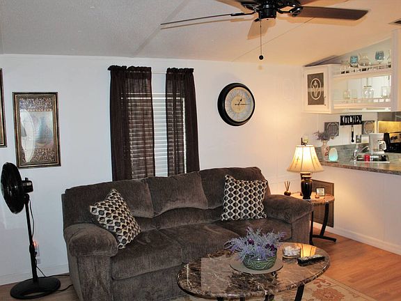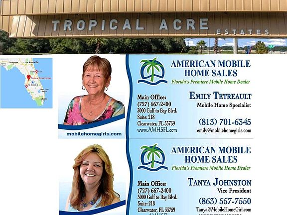 **EXCLUSIVE LISTING CONTACT LISTING AGENT OR VISIT MOBILEHOMEGIRLS DOT COM*** PArtially Furnished. Introduce yourself to your Florida dream home away from the cold winters, this true turn-key, super clean manufactured home priced at only $39,900. RECENT Updates to the home include, appliances, water heater, roof, siding, air conditioner and much more!! This is a must see home! LIVING ROOM: 13 x 13' 5 Beautiful bright and open with newer laminate wood flooring and a ceiling fan.. KITCHEN/DINING: 11' 2 x 10 New Laminate wood Flooring, Tons of cabinetry and ample counter space. Appliance Include: Newer Whirlpool Stove, Newer Frigidaire Refrigerator, Microwave. Window treatments remain MASTER BEDROOM: 11 x 11' 9 Located at the front of the home with newer carpet and a private bath. Large closet that measures 2 x 4' 5 with sliding doors. All window coverings included. MASTER BATH: Private to the master bedroom with a walk in shower and the perfect size vanity with a mirror. New Vinyl flooring. GUEST BATH: Private at the other end of the home with separate door for privacy, open to the guest bedroom. Tub/shower combo, newer laminate flooring. GUEST ROOM: Located at the far end of the home is a private guest room with new laminate flooring and a closet that measures 2 x 9' 4. All window coverings included. Private entry to guest bath shower area. LAUNDRY: 5'3 x 5 Located in the hall inside the home with cabinet above. Newer Hotpoint washer and dyer included! SCREENED ROOM: 11' 4 x 14' 6 Perfect for those comfortable Florida days to relax with friends. ATTACHED SHED: 8 x 9 Great for all your other storage!!! LOT RENT OF $509 COVERS, TRASH, POOL, AND AMENITIES. RESIDENTS PAY WATER BILLED THROUGH THE PARK ABOUT THE PARK: Tropical Acres is a Gorgeous Community in a Country Setting. The Daily, Weekly and Monthly Activities are held in the Residents Club House. You will Love the Large Swimming Pool with a Deck and a Gorgeous Hot Tub. Additional Features: Onsite Billiard Room, Lending Library, Lounge, Horseshoes and Shuffleboard. On site Laundry Mat, You will Love Living Here! There is Always Something Going on and the Grounds are Very Manicured! Zephyrhills is a beautiful area there is shopping close including a Wal-Mart Super Center and Publix Supermarket. Florida Hospital Zephyrhills is only 5 miles. PLUS, The Park is 20 miles to Busch Gardens!! All listing information is deemed reliable but not guaranteed and should be independently verified through personal inspection by appropriate professionals. American Mobile Home Sales of Tampa Bay, Inc. cannot guarantee or warrant the accuracy of this information, measurements, or condition of this property. Measurements are approximate. The buyer assumes full responsibility for obtaining all current rates of lot rent, fees, or pass-on costs associated with the community, park, or home from the community/park manager. American Mobile Home Sales of Tampa Bay, Inc. is not responsible for quoting of said fees.