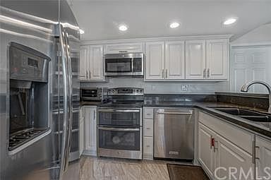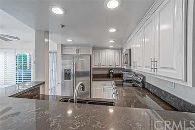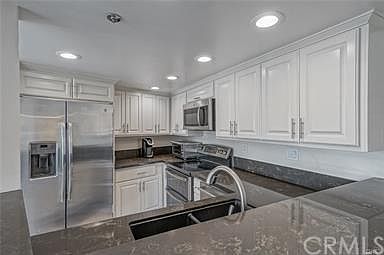 Remodeled single-story end unit at the gated Allegro Villas. Two bedrooms two bathrooms all new interior paint with recessed lighting and tile floors. Custom cabinetry in the kitchen with quartz countertops and stainless steel appliances. Newer carpet in both bedrooms and custom cabinets with quartz countertops in bathroom. Master walk in closet. Indoor laundry. Private patio for barbecuing and storage. One car shared garage and 1 assigned carport included. Association includes pool, spa, walking area for pets, exterior maintenance, common grounds, water, trash and guest parking. Easy access to 57, 60 and 10 Freeways.