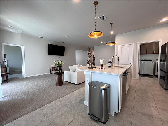 Move right into this beautiful one-year old home located in Parkview preserve in Apoka FL. This home offers an open floor plan with a large living and dining areas and lots of natural light. The kitchen is designed with a large island fitted with a gorgeous quartz counter-top, two pantries, plenty of cabinet space and a gas stove. The master suite offers a dual sink vanity, a large walk-in closet, tiled shower, and a private commode area. The foyer is finished with attractive millwork to add to the beauty of this one-of-a-kind property. The guest bathroom is newly updated with an above counter sink and beautiful quartz countertops. Enjoy peaceful evenings on the lanai overlooking your beautiful backyard with no rear neighbors!. The property is fully fenced. Washer and dryer are included. Parkview Preserve offers amenities that include a playground, dog park, walking trails and a beautiful pool and cabana. This home will not last.