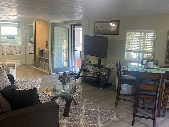 FURNISHED APARTMENT. SHORT TERM OK, 30 -90 day stay. Former ManCave now beautiful studio apt. with many amenities. OVER 500 sq. ft. plus two patio areas. The back patio has a (shared) spa and 'THE ONLY' SHOWER FOR THE STUDIO - a large outdoor, stone and marble shower. The indoor half bath has an upgraded tank top sink. Fully stock kitchen including dishes, silverware, pot s& and pans, 2 hot plates, air fryer, microwave, coffee maker, refrigerator, NO STOVE. Other Man Cave amenities include: 50" Flat Screen on wheels, viewable from anywhere; stacked washer/dryer; Cal King pedestal bed with privacy doors; & lighted mirror dressing area. One parking space on site. The patio has table, chairs, BBQ and enjoys great sunsets. Yard area includes spa, pool, bonfire pit, horse shoes and CORNHOLE!! TERMS ON DEPOSIT POSSIBLE. We are freeway close to all, easy in and easy out!! Highways 94 & 125 within blocks. Large Studio , furnished. All utilities, internet, TV included. 1-3 months term OK.