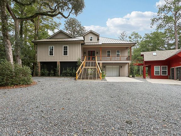 Welcome to your own private waterfront retreat! Set on a spacious and secluded lot, this home has been completely built new from the ground up and offers the perfect blend of charm, comfort, and functionality. Inside, you'll find rich hardwood floors, exposed wood ceiling, and inviting living spaces that flow effortlessly to both a welcoming front porch and a relaxing back porch with serene water views. The property is designed for convenience and versatility, featuring a garage with an elevator that carries you directly to the top level of the home. A separate guest suite offers its own private bath and washer/dryer, ideal for visitors or extended stays. For hobbies, storage, or creative pursuits, the estate includes a huge workshop and an air-conditioned garage/studio space. Outdoor living shines with a large screened patio equipped with water and electricity, perfect for entertaining, as well as a private boat dock for easy access to the water. See Features Page.