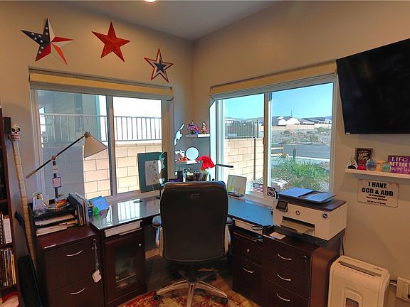 Nestled at 3775 Ramsey RD, in Bullhead City, Arizona, this single-family residence, with a 50' deep RV garage presents an attractive opportunity to embrace the Arizona lifestyle. This SMART Home, Built in 2020, is in great condition. Control the air conditioner and garage door openers with a touch of your smart phone. The Electric window shades are in the 2nd bedroom/office, laundry room and the living room. Imagine stepping into the bathroom, where a tiled walk-in shower awaits, offering a spa-like experience every day; the double vanity provides ample space, making mornings a breeze and the LED lit mirrors provide you with just the right amount of light you need. The kitchen is a culinary dream, featuring stone countertops that provide a sleek and durable workspace, complemented by a stylish lit backsplash, Porcelain Farm Sink, modern appliances, and a convenient kitchen bar and peninsula. The custom kitchen cabinetry features soft close drawers and doors. The kitchen corners are accessed by built in turntables. The flooring throughout is ceramic plank flooring. The allure of outdoor living is undeniable, with a patio that extends your living space into the fresh air; picture yourself enjoying meals in the outdoor area, all within the privacy of a fenced backyard with a view! The property also has a tiled roof and a laundry room for convenience. The mountain views offer a stunning backdrop to your daily life. This residence is an invitation to experience comfort and style in a vibrant setting. Most of the furnishings stay as do all tvs except for the back patio tv. Not located in a HOA.