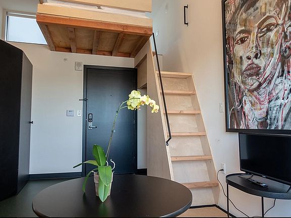 Furnished studio with a cozy sleeping loft above. Large windows bring in natural light and fresh air, creating a bright, airy feel. Includes mini fridge, microwave, hot plate, and utensils. The fee for Wi-Fi, and all utilities is $200/month. Perfect for traveling professionals seeking comfort, function, and character.