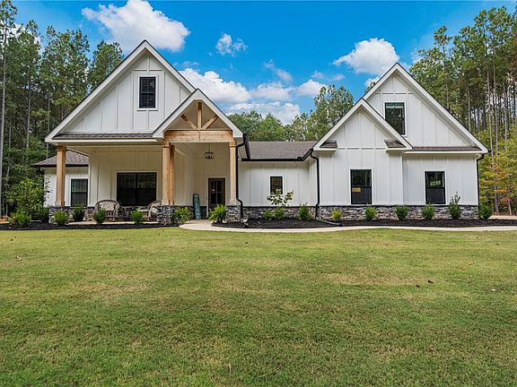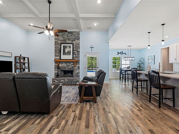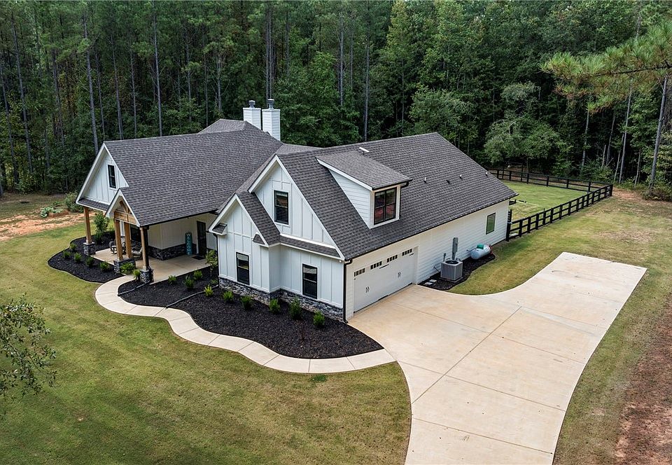 Nestled on 5 private acres, this stunning craftsman-style home with black windows, stone accents, and cedar details offers the perfect blend of luxury and country living. A grand entrance with a deep covered front porch welcomes you inside, where you'll notice gorgeous LVP flooring that flows throughout. The spacious living room features floor-to-ceiling stacked stone wood-burning fireplace, serving as the centerpiece of the open floor plan. The eat-in kitchen is a showstopper, complete with an oversized island, stainless steel appliances, subway tile backsplash, granite countertops with a leathered finish on the island, and an incredible walk-in pantry. The pantry provides extra storage with built-in cabinetry, butcher block counters and custom shelving. The owners suite is located on the main level. The master bathroom features a soaking tub, separate tiled shower, dual vanities with additional cabinetry, and enormous walk-in closet that conveniently connects to the spacious laundry room. The laundry includes granite countertops, a sink, abundant cabinetry, and is accessible from both the master suite and the mudroom/drop zone off the garage. The split floor plan offers three additional bedrooms on the main level, each with ample closet space, as well as a large secondary bathroom with dual vanities. Upstairs, you'll find a versatile bonus room with a full bath.The screened-in back porch, complete with a cozy fireplace, is perfect for morning coffee. Beyond the porch, the sparkling saltwater pool invites you to relax and soak up the sun. The large patio and beautifully maintained fenced yard offers plenty of room for entertaining. Whether hosting summer parties, floating the day away, or enjoying a quiet evening by the fire, this backyard feels like a vacation without ever leaving home. Extras include blown-in insulation for enhanced energy efficiency and comfort year-round, specialty ceilings, an upgraded trim package, and thoughtful finishes throughout.