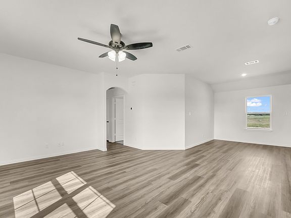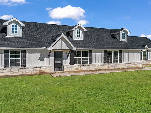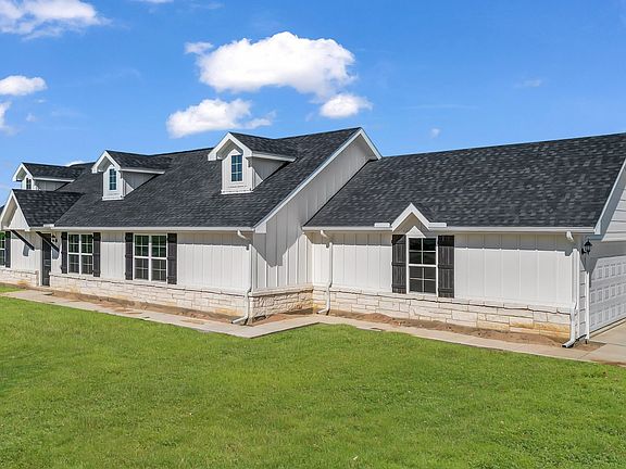 Brand-new John Hunter Home Builders’ Silver Series home on 2 secluded acres in Poolville, TX! This 4-bedroom, 2-bathroom modern farmhouse offers the perfect mix of rustic charm and designer touches. Featuring the Silver Series Farmhouse Elevation, the home is dressed in classic white with stone wainscoting, black farmhouse fixtures, and gutters across the front.
