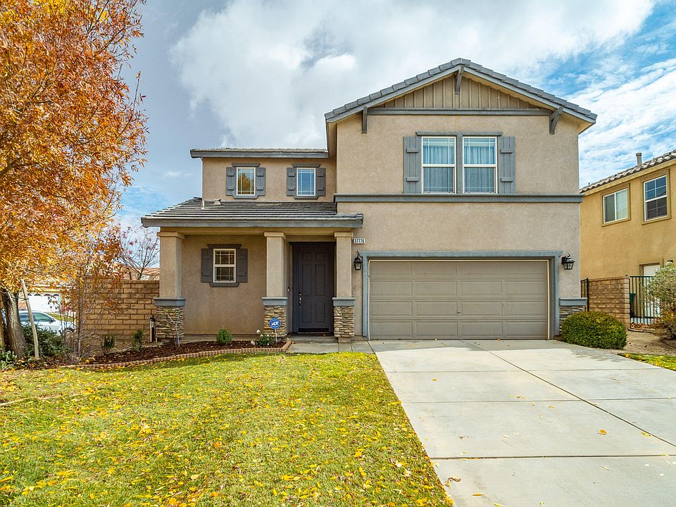 Beautiful corner lot, upgraded 2 story Ana Verde West Palmdale Home. Open & spacious floor plan with large living room with fireplace open to dining room & kitchen. Oversized tile flooring in the kitchen & dining area, granite counters, beautiful maple cabinets with stainless steel appliances, custom lighting fixture & sliding glass door to back yard. There is a powder room/bathroom downstairs off the entry. Upstairs the primary bedroom is spacious with ceiling fan & windows overlooking back yard and hills. Attached primary bathroom with dual sink vanity, separate bathtub & shower & massive custom-built closet for maximum storage or organization. Both secondary bedrooms are spacious with closets/closet organizer and share a bathroom (jack 'n jill style) with large vanity, tile floors & tub/shower combination. The laundry room is conveniently upstairs. Custom covered patio in back yard with ceiling fan, oversized corner lot with block wall fencing as well as an attached 2 car garage.