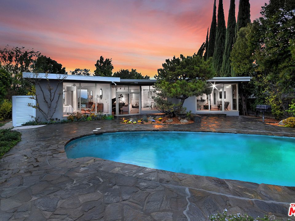 Mid Century Modern with pool and beautiful views located on a quiet and flat cul-de-sac street in the hills of Sherman Oaks. Light filled open floor plan with wood beam ceilings and walls of glass. 4 bedrooms plus den, large living room with fireplace and separate formal dining area. Hardwood floors, new paint and carpet throughout. Spacious master bedroom suite with dressing area and attached bath including a walk-in glass shower. Private yard with lounging areas, deck and patio to entertain. Ideal location close to Mulholland Drive and the Westside.