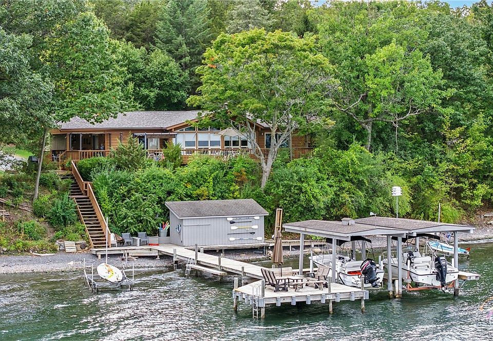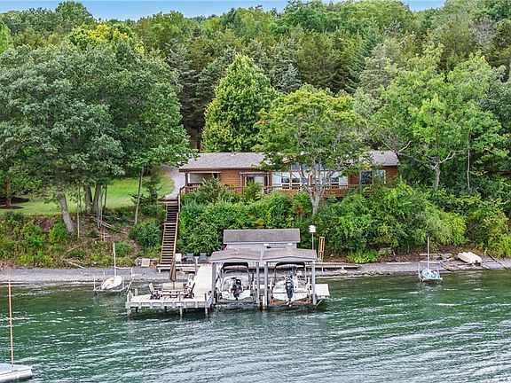 Once in a life time family haven on Seneca Lake! Incredible opportunity to own a heritage property of 3 parcels totaling 15 acres of land, 305 feet of lake frontage and 3 "living" structures. Starting on the water- impressive 3 bedroom year round home with 2 full bathrooms- full of character and meticulously maintained throughout. This on-the-water ranch style home has large decks overlooking permanent dock with 2 covered boat hoists, boat house, and impressive beach with impeccably private views. Additional seasonal cabin has full kitchen, covered porch, living room and full bath. Large 2 car garage with extra tall doors, storage for maintenance and lake front toys. Additional bath house has full bathroom and sleeping quarters! Lush gardens and woodsy trees provide many places to unwind and escape away in peace and privacy. The setting is unlike anything you will find! Pride of ownership shown throughout after 40+ years of creating and cultivating a legacy Finger Lakes property. This is a see-it-to-understand kind of property.