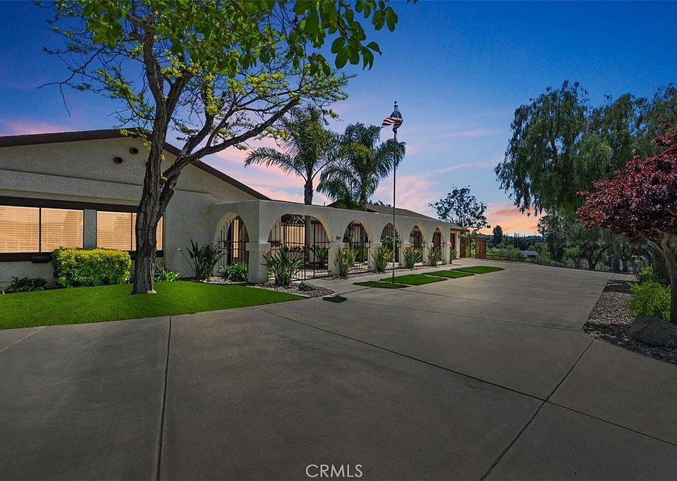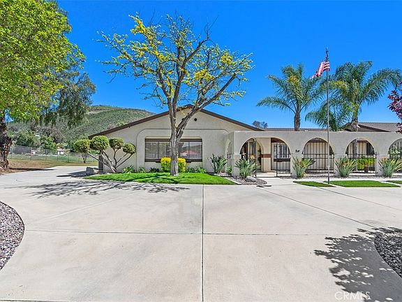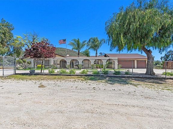 Welcome to this exceptional Murrieta estate—a custom single-story oasis set on 3.26 acres of peaceful, well-maintained land that offers the perfect blend of natural beauty, usable space, and a lifestyle designed for both relaxation and recreation. This meticulously remodeled single-story home offers a harmonious blend of modern luxury and serene country living. The open-concept design is accentuated by a stunning tongue-and-groove wood beam ceiling and a floor to ceiling stone fireplace in the living room that adds warmth and natural beauty to the space, bench window seating, new stainless steel appliances, granite countertops and high-end finishes chosen with impeccable taste. Freshly painted and thoughtfully upgraded, the home features luxury vinyl flooring, soft carpet in the bedrooms, new baseboards throughout. Featuring 3 spacious bedrooms and 2.5 nicely updated bathrooms. The bedrooms are oversized, including a luxurious primary suite with a generous walk-in closet. Both full bathrooms feature double sink vanities. New window coverings are installed throughout the home for a clean, finished look. Step outside to your private backyard paradise, professionally landscaped to perfection. Dive into the sparkling swimming pool, relax under the patio, or cook under the stylish cabana and entertain guests in this idyllic setting. The backyard is beautifully enclosed with vinyl fencing, creating a safe and private outdoor sanctuary. The entire 3.26-acre property is surrounded by secure chain-link fencing, providing peace of mind and space for RVs, boats, trailers, and all your recreational toys. A three-car garage and storage shed add convenience and flexibility. Equestrian enthusiasts will appreciate the riding arena and pipe corrals, offering plenty of room for horses and the potential to expand. A charming seasonal creek meanders through the property, complete with a bridge crossing, and is adorned with mature walnut, pepper, and eucalyptus trees, creating a tranquil and shaded environment. All landscaping is on a water-efficient drip system, including an automatic setup for the yards. Close to parks and located in the highly-rated Murrieta Valley Unified School District. With ADU potential, serviced by a private well with optional city water connection available, no HOA, and close proximity to shopping, restaurants, and hospitals, this Murrieta gem has it all.