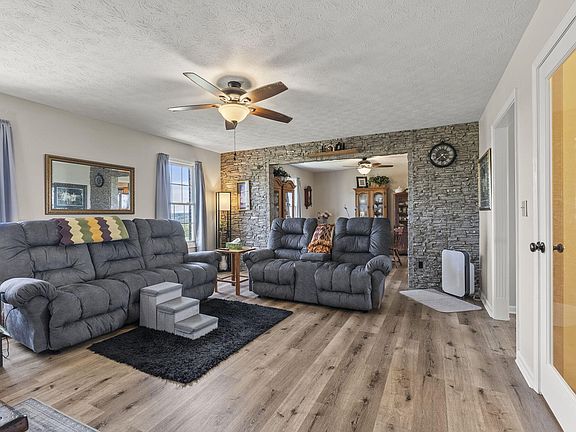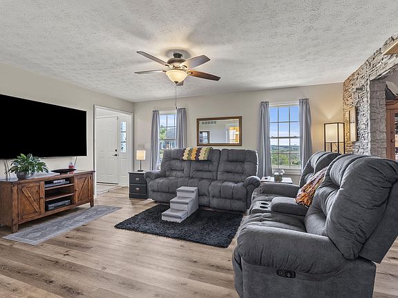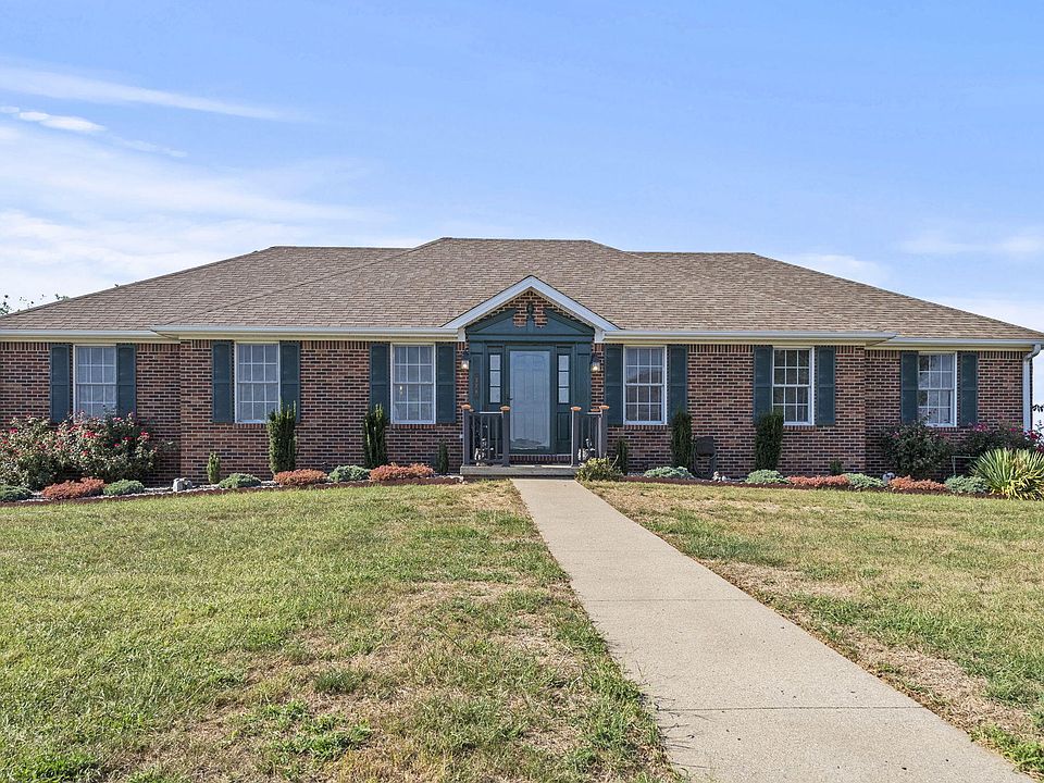 Listed BELOW appraisal! Welcome to this beautifully maintained brick home that blends comfort, functionality, and sweeping country views. The main level features three bedrooms and two full bathrooms, with a bright, open kitchen offering ample cabinetry, modern appliances, and an island with seating. The adjoining dining nook highlights a bay window with stunning views, while the living room boasts a warm stone accent wall and abundant natural light. The spacious primary suite provides a relaxing retreat, complemented by walk-in closets. The updated laundry room with a large sink for everyday convenience. Step outside to the back deck and take in breathtaking views of rolling hills and wide-open skies. Downstairs, the finished basement (completed in 2019) expands your options with an additional bedroom, full bath, kitchen, and living area—ideal for guests or multi-generational living. The basement is fully insulated, carpet-free, and offers a massive 1,100+ sq. ft. storage area with endless possibilities for hobbies, a workshop, or organization. Major updates include a new HVAC and roof in 2019, ensuring peace of mind. With thoughtful upgrades, storage galore, and move-in-ready finishes throughout, this home offers the perfect combination of small-town charm and modern comfort.