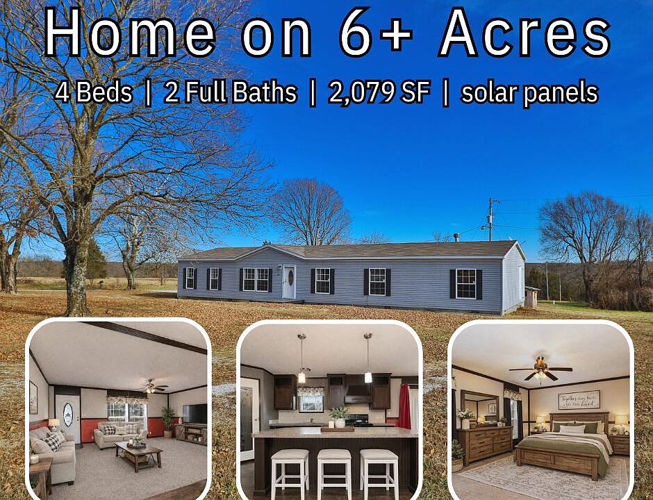 Spacious double-wide mobile home on 6 beautiful acres. This home offers the added benefit of solar panels, helping keep utility costs low with an average electric bill of approximately $20 per month. An energy-efficient feature that adds long-term savings and value.Property is conveniently located close to the town of Humansville and just off Hwy 13. This well-maintained home offers 2,079 sq ft of living space with 4 bedrooms and 2 full bathrooms, featuring a desirable split-bedroom layout. Enjoy both a comfortable living room and a separate family room with cozy fireplace, providing plenty of space for relaxing or entertaining.The large kitchen includes ample cabinetry, generous counter space, and a pantry, while a large utility/laundry room adds extra convenience and storage. The primary suite is a true retreat with a spacious bathroom featuring a walk-in closet, walk-in shower, and soaking tub.Enjoy the balance of peaceful acreage living with close proximity to town amenities.